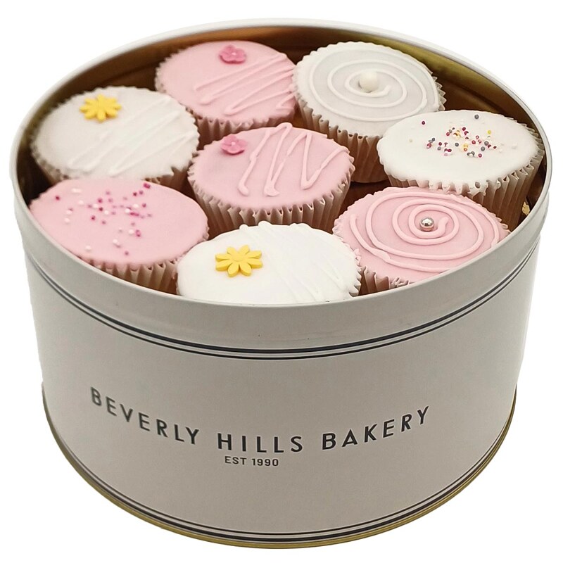 These gorgeous pink cupcakes are made of soft vanilla sponge, a light pink sugar frosting and the other half with white sugar. Each tin contains 16 cupcakes, elegantly packaged with pink gingham cloth tied and ribbon.