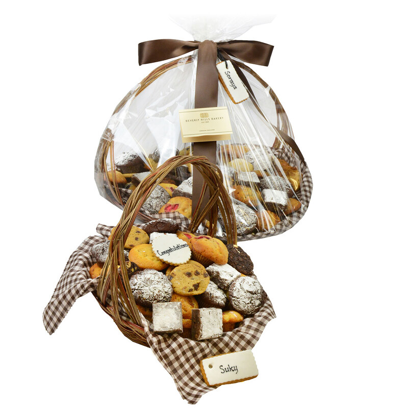 Filled with our classic range of mini muffins, cookies and brownies with a handmade "Congratulations" cookie banner and a hanging "Name" cookie, packaged in brown gingham cloth and ribbon.
