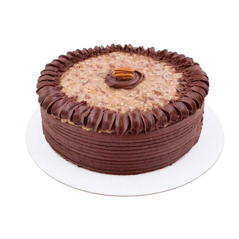 Our traditonal German Chocolate Cake is a gorgeously rich and moist layered chocolate sponge cake made with bittersweet chocolate filling with a Coconut and Californian Pecan frosting, topped with crushed pecans,tasty coconut shavings, and whole pecans. First created in 1957 in Texas, it became quite the sensation!
