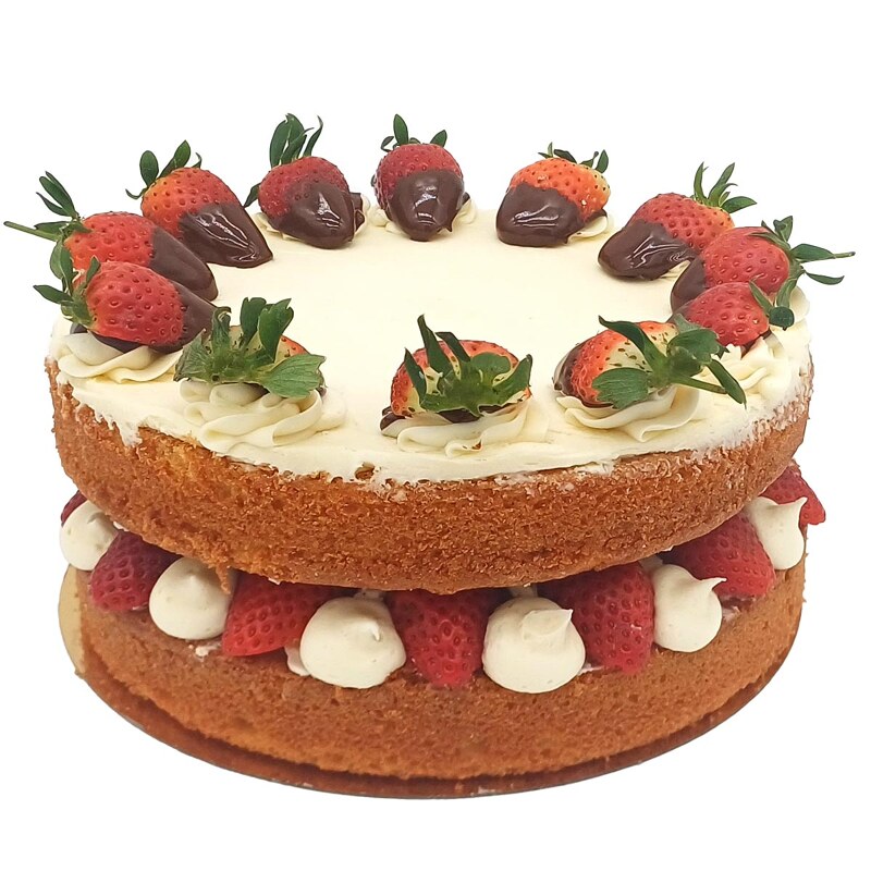 Our traditional Strawberry Victoria Sponge Cake is made of soft buttery sponge with cream cheese frosting and fresh strawberry filling, topped with more fresh strawberries dipped in chocolate and a dusting of icing sugar. Perfect for afternoon tea!