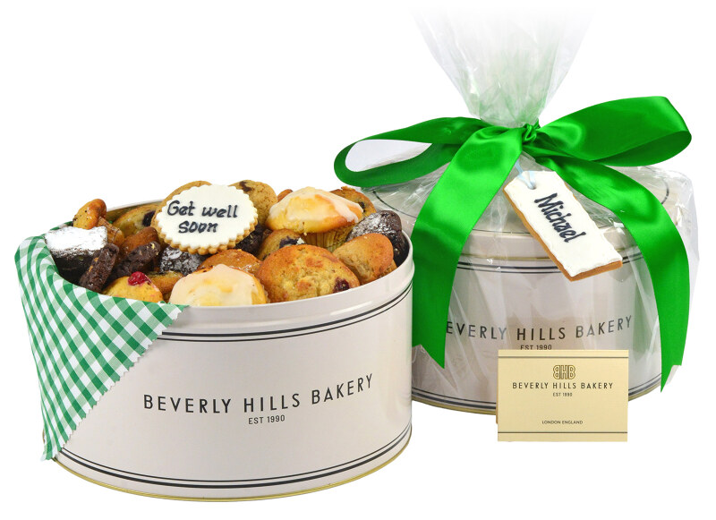 Our Get Well Gift Tin is a kind and supportive way to wish a loved one or colleague best wishes for a speedy recovery. Filled with our Classic range of muffins, cookies and brownies with an additional handmade "Get Well Soon" cookie banner and a personalised hanging "Name" cookie. Decorated in green gingham cloth & ribbon. The first name of the recipient as printed on the delivery section will be chosen for the cookie.